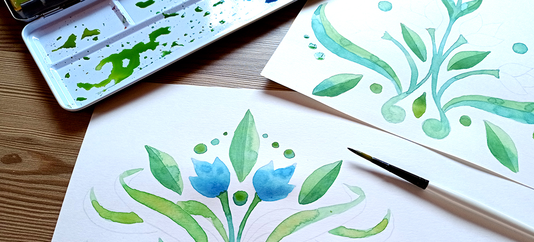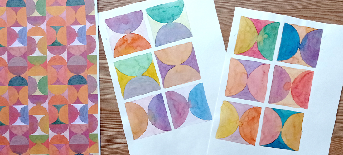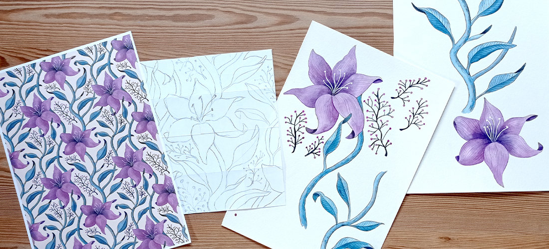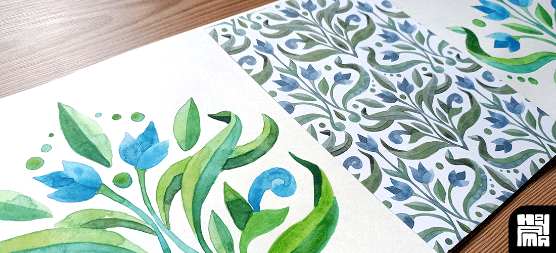 En esta sección muestro algunas fotografías del proceso de diseño de algunos patrones, partiendo del diseño del rapport a lápiz, el pintado de los diferentes elemenos a mano con acuarela, para el posterior escaneado y montado final del patrón infinito con software de edición.